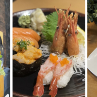 7 sushi - avocado, sweet tofu, seaweed salad, mushroom, fried shishito pepper, asparagus, radish and mixed vegetable cut roll